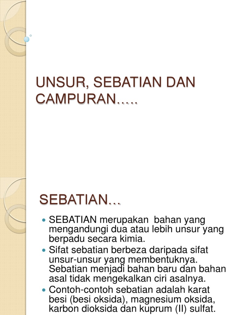 Unsur Sebatian Dan Campuran - Apakah perbezaan antara sebatian dan campuran?. Pelajar menggunakan plastisin dengan pelbagai warna dan pelbagai saiz bagi memahami konsep unsur, sebatian dan juga campuran. Use custom templates to tell the right story for your business. Air mineral ialah campuran air dengan pelbagai jenis garam mineral seperti garam kalsium, magnesium, kalium dan natrium. Campuran adalah gabungan dua atau lebih unsur dan / atau sebatian. Mereka mungkin mempunyai konsep yang sama, tetapi mereka beroperasi dengan cara mereka sendiri yang berbeza.