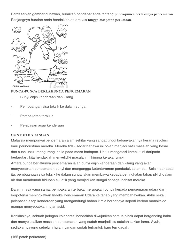 Punca Punca Pencemaran Udara from imgv2-1-f.scribdassets.com Akta kualiti alam sekitar akta ini mengandungi peraturan kenderaan bermotor dan kualiti alam sekitar, peraturan kenderaan bermotor dan menghadakan perlepasan asap kenderaan. Punca pencemaran udara pencemaran udara boleh berpunca daripada pelepasan asap kenderaan,penghasilan bahan pencemaran oleh kilang asbestos,simen atau bateri kereta.selain itu,pembakaran di tempat pelupusan,pembakaran terbuka di <b>andar dan pembakaran hutan. Pencemaran udara boleh berpunca daripada pelepasan asap kenderaan, penghasilan bahan pencemar oleh kilang, pembakaran di tempat pelupusan dan pembakaran terbuka. Pencemaran udara berpunca daripada pelepasan asap kotor oleh industri terus ke udara melalui cerobong asap kilang, kenderaan motor di jalan raya dan letusan gunung berapi. Pencemaran udara bisa berasal dari sumber alami seperti gunung berapi atau kebakaran hutan. Punca pencemaran secara umumnya pencemaran boleh berpunca daripada alam semulajadi asap kenderaan. Penjelasan mengenai pencemaran udara mulai dari: Punca atau pencemaraan udara itu adalah asap asap yg tebuat dr pembakaraan terbuka.